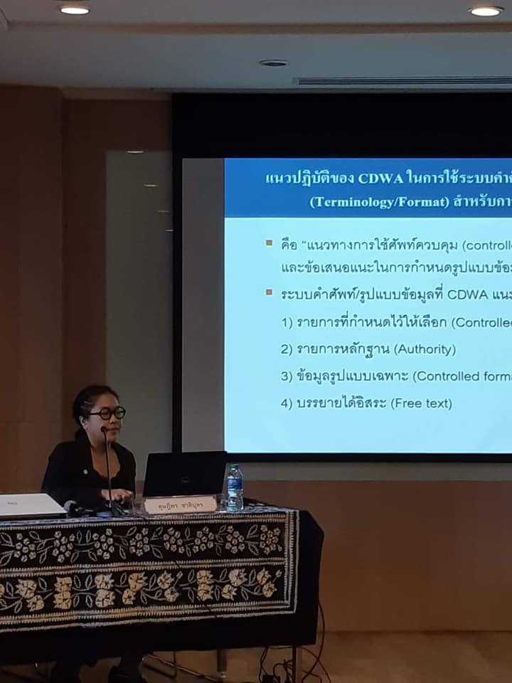 นางสาวดุษฎีพร ชาติบุตร ได้นำเสนอบทความเรื่อง “ระบบคำศัพท์/ รูปแบบข้อมูลที่ใช้ในการลงรายการงานศิลปะและวัตถุทางวัฒนธรรม กรณีศึกษามาตรฐานเมทาดาทา ชุด หมวดหมู่สำหรับการอธิบายงานศิลปะ (CDWA)” ในการประชุมวิชาการทางมานุษยวิทยา ครั้งที่ 13 “มนุษย์ในโลกดิจิทัล”
