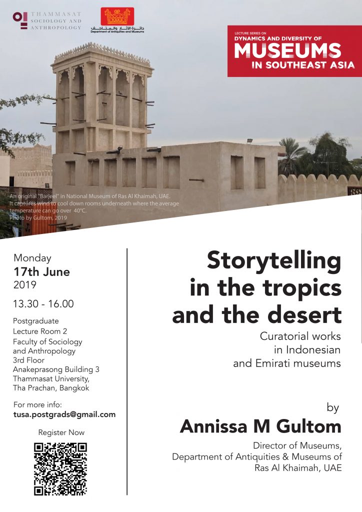 ขอเชิญร่วมฟังการบรรยาย และแลกเปลี่ยนประสบการณ์เกี่ยวกับพิพิธภัณฑ์ในหัวข้อ “Storytelling in the tropics and the desert: Curatorial works in Indonesian and Emirati museums”