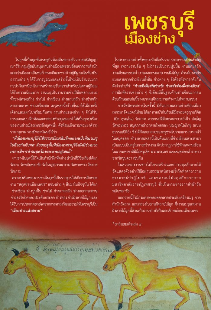 The prosperity of crafts during this period laid the foundation for the continuation of various “Phetchaburi artisan schools” to the present day. These include painters, stucco sculptors, carpenters, woodcarvers, paper-punching artisans, lacquer and glass-inlaid gilding artisans, goldsmiths, and mother-of-pearl inlay artisans. For this reason, the Ministry of Culture has honored Phetchaburi as the “City of Artisans of Siam.”