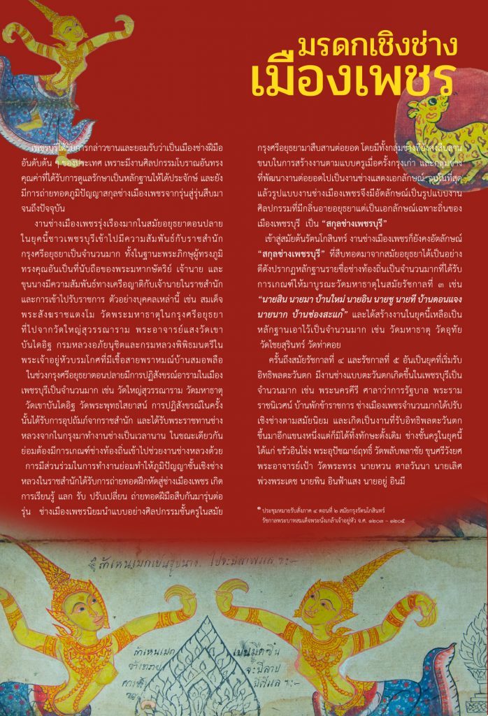 Entering the early Rattanakosin period, Phetchaburi’s artisanry continued to maintain its distinct “Phetchaburi Artisan School” identity, which carried the style that was passed on from the Ayutthaya period. This is evidenced by the names of numerous local artisans who were drafted to renovate Wat Mahathat during the reign of King Rama III. Examples of these artisans include “Nai Sin, Nai Ma of Ban Mai; Nai In, Nai Chu, Nai Thi of Ban Don Chaeng; and Nai Nak of Ban Chong Sakae.” (Collected Royal Orders, Part 4, Section 2: Rattanakosin Period, Reign of King Rama III, C.S. 1203 – 1205)