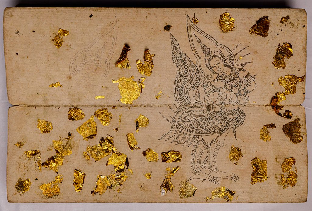 This exhibition features examples of Phetchaburi’s painting crafts, including a “lotus-at-the-bottom-of-the-bowl designed by Phrakhru Yanawichai (Yit Suwanno)” of Wat Ko, a kanok pattern by Phra-ajarn Pao Panyo of Wat Phra Song, and a pattern book of traditional Thai designs by Panyaphalo Bhikhu (Naeb Suwanpatti), who copied the works of ancient master craftsmen into a khoi book. These pattern books serve as sought-after templates and teachers for painters in their work, as seen in the painting skills used in the Vessantara Jataka scenes by master artisan Lert Puangpradej, and in a star divination khoi book from Wat Khun Tra.