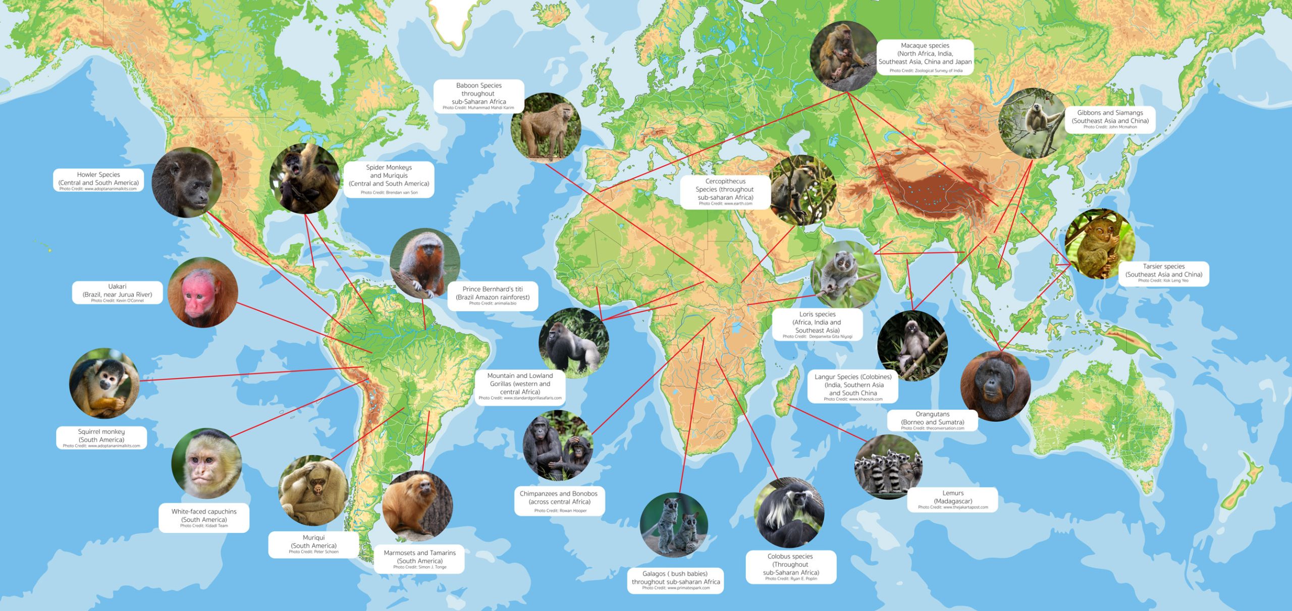 ซึ่งมีความแตกต่างหลากหลายในด้านรูปลักษณะ ขนาดร่างกาย พฤติกรรม ถิ่นที่อยู่ รวมถึงอาหารการกิน สัตว์ในอันดับไพรเมตที่มิใช่มนุษย์ มีถิ่นที่อยู่กระจายอยู่ใน 4 ทวีปทั่วโลก คือแอฟริกา เอเชีย ยุโรป (เฉพาะบริเวณ ช่องแคบยิบรอลต้าร์) และอเมริกาใต้