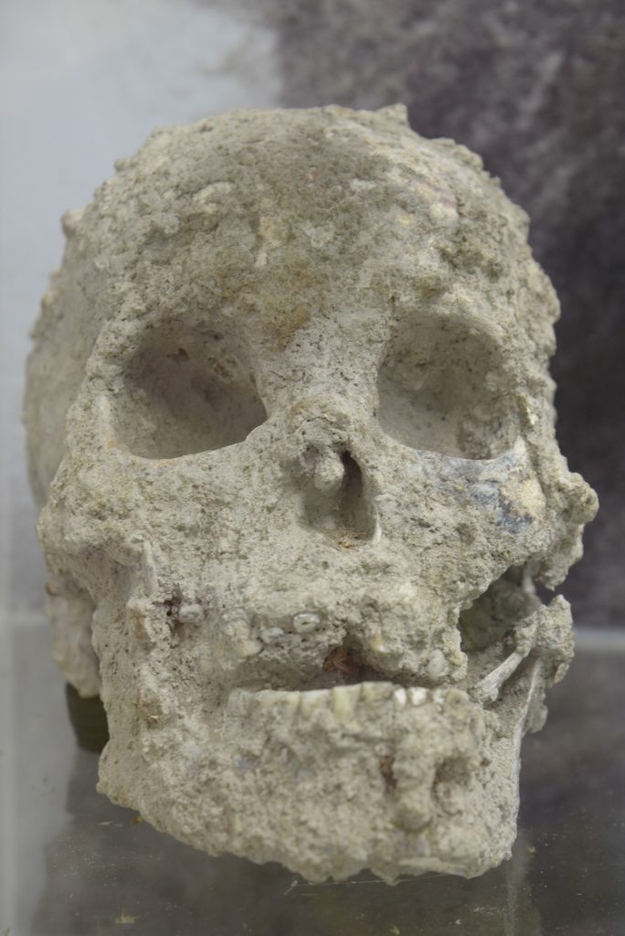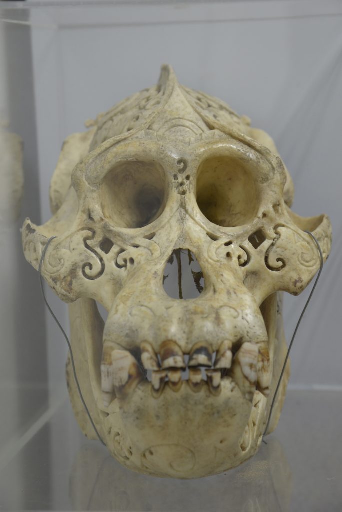 กะโหลกอุรังอุตัง กะโหลกอุรังอุตัง เพศผู้ พันธุ์บอร์เนียว (Pongo pygmaeus) ถือเป็นวานรขนาดใหญ่ไร้หางที่มีวิวัฒนาการใกล้กับมนุษย์ ในกลุ่มชนดายัค (Dayak) บนเกาะบอร์เนียว อินโดนีเซีย ใช้กะโหลกของอุรังอุตังในพิธีกรรมเป็นตัวแทนของศีรษะมนุษย์