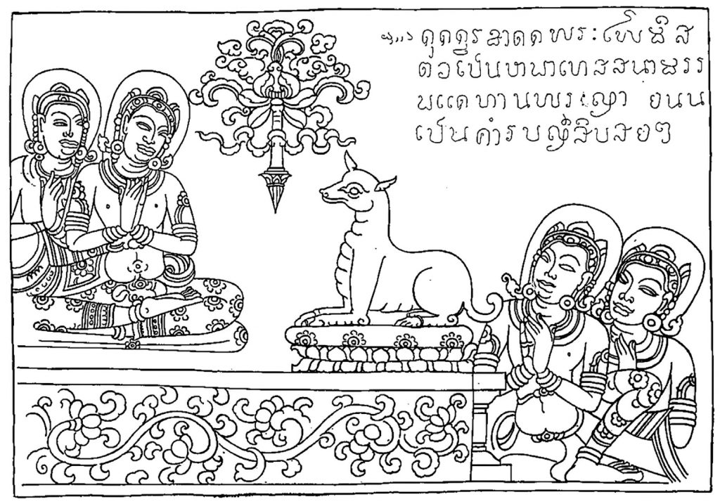 จารึกและภาพเล่าเรื่องอดีตชาติของพระพุทธเจ้าเรื่องนี้คือ กุกกุรชาดก กล่าวถึงพระโพธิสัตว์ครั้งเสวยชาติเป็นพญาสุนัข และใช้สติปัญญาช่วยเหลือสุนัขจำนวนมากที่ถูกพระราชาสั่งฆ่า เนื่องจากเข้าใจผิดว่าสุนัขจากนอกพระราชฐานมาลอบกัดกินหนังหุ้มราชรถ